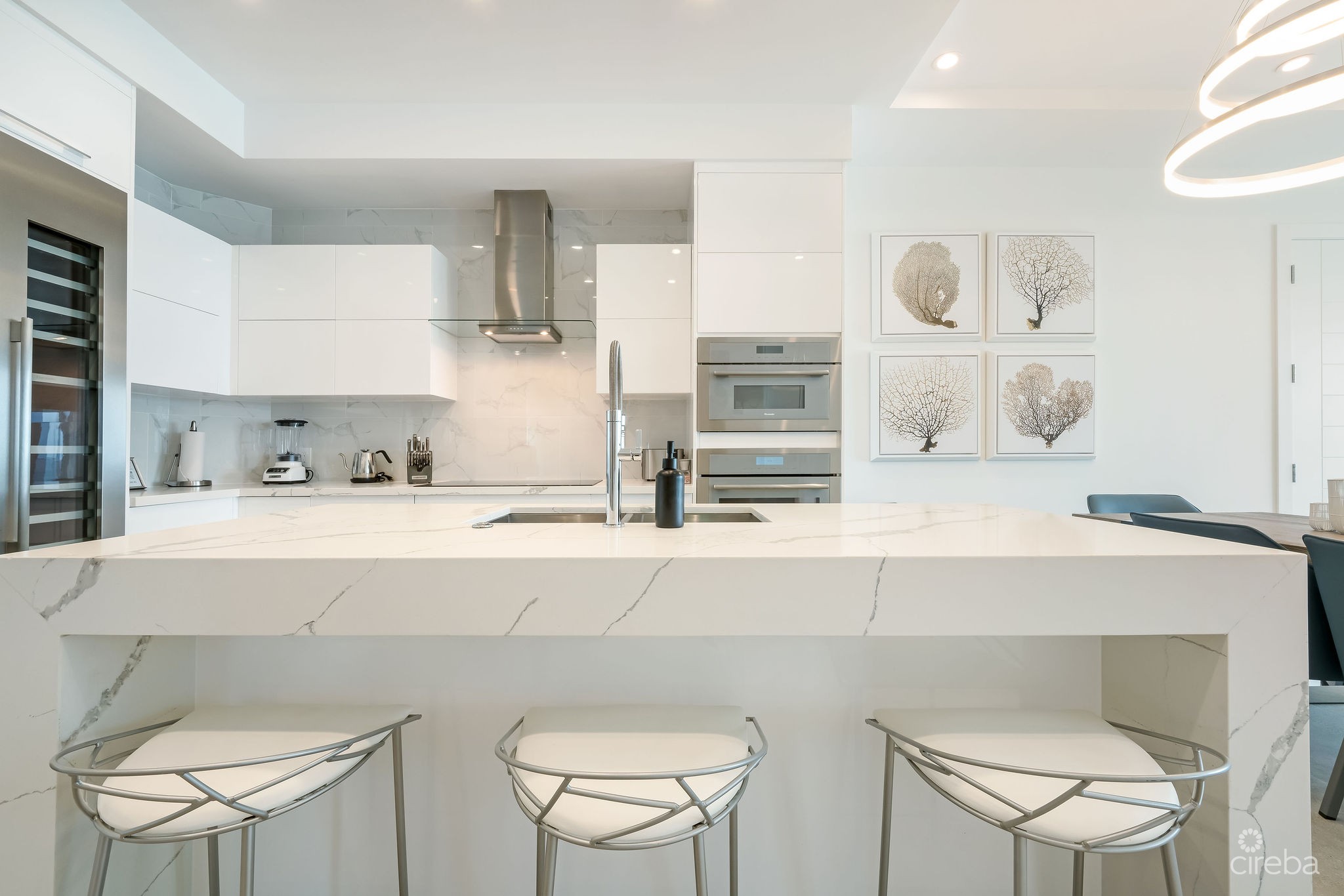 Welcome to Rum Point Club Residences in Cayman Kai. Built in 2020, this spacious two-bedroom floor plan was the quickest to sell at pre-construction, offering tremendous square footage, a fantastic layout, and unique value as an end unit. The kitchen features a thick marble look quartz countertop and top-of-the-line Thermador appliances, including a 70-bottle wine fridge and induction cooktop. Upon entering, your eye is immediately drawn through the living room and out onto the expansive North-facing shaded patio, where you can enjoy uninterrupted ocean views and alfresco dining. The primary bedroom and its large ensuite bathroom overlook Cayman’s crystal clear turquoise waters, which feature some of the best marine life and snorkelling on the Island. The second bedroom has access to its own ensuite, sleeping an additional two guests in comfort with large windows providing an abundance of natural light.