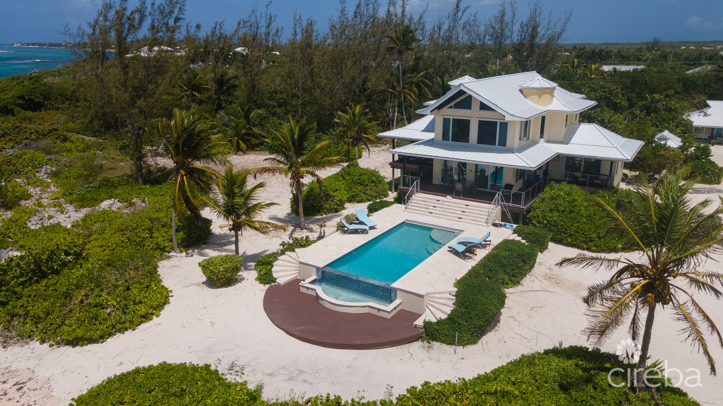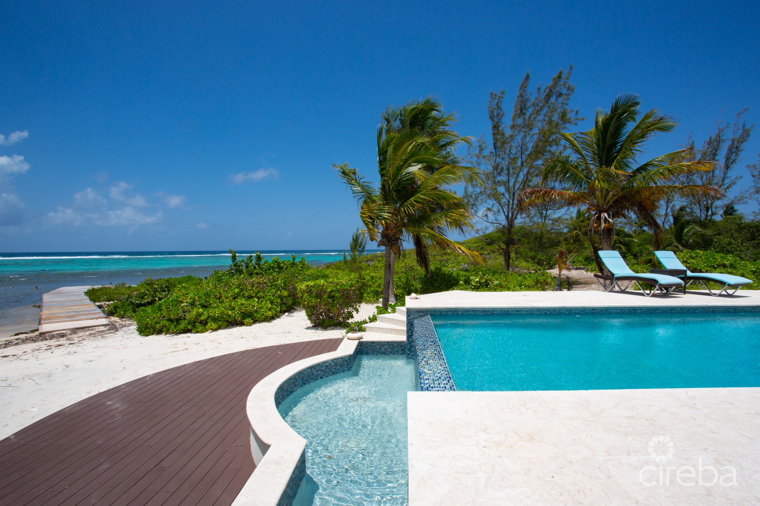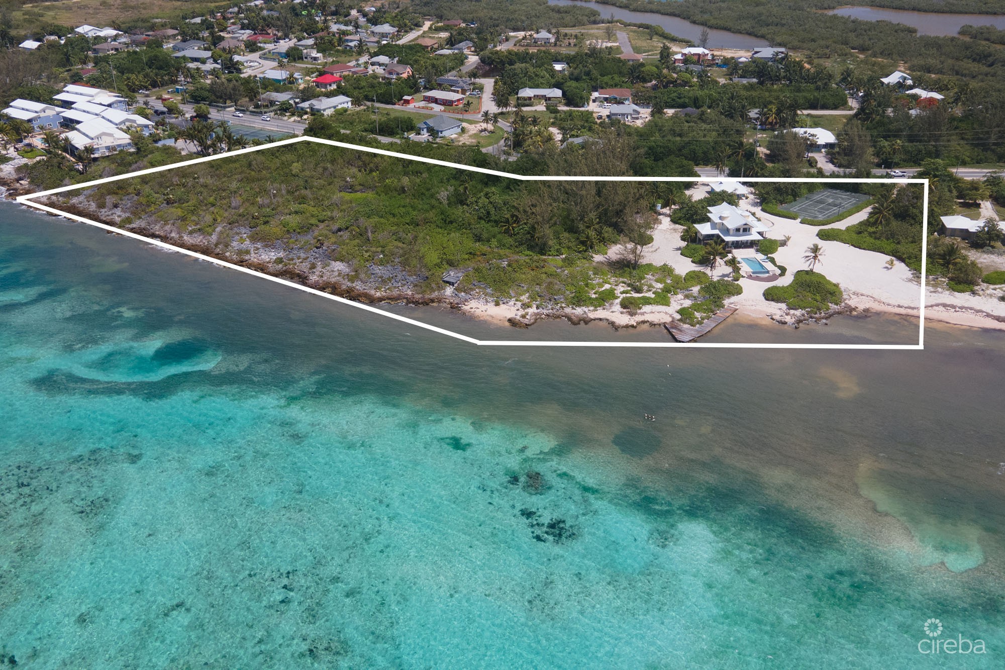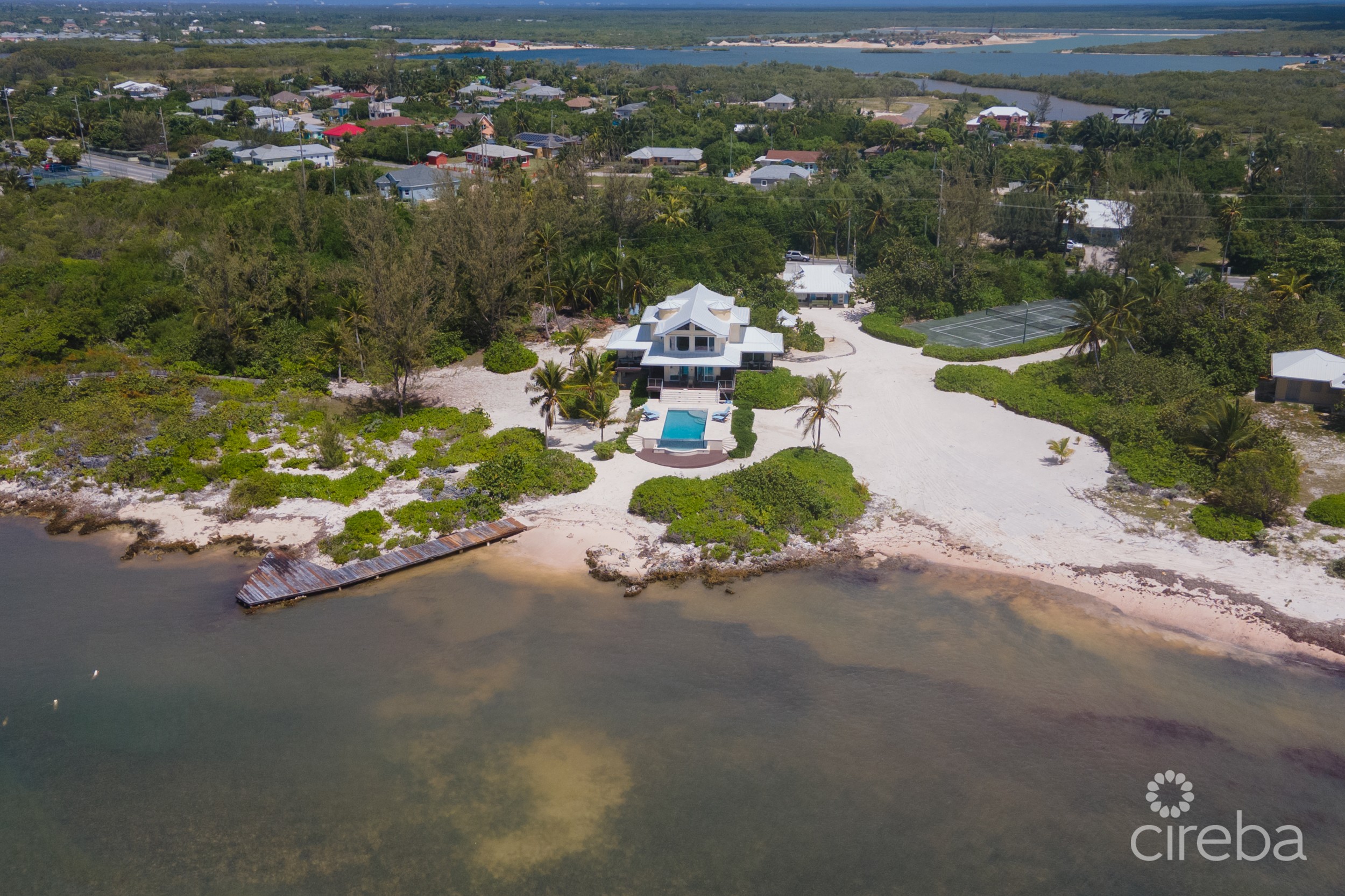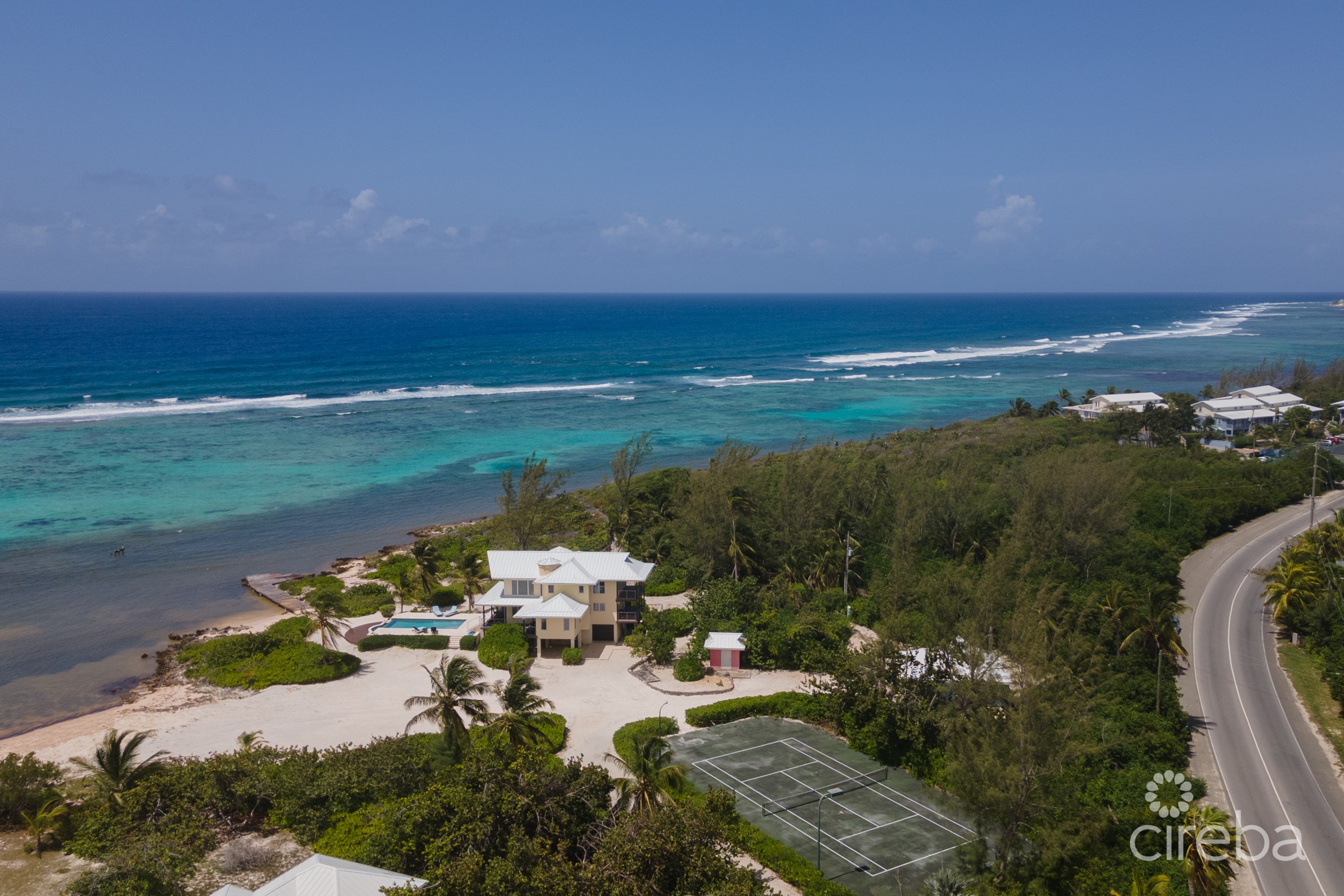 Villa Maria is an exceptional beachfront estate overlooking the incredible waters of Pease Bay, Grand Cayman and offering some of the most mesmerizing Caribbean Sea views seen anywhere in the Cayman Islands. The estate comprises a primary three bedroom residence, 1 bed guest cottage, tennis court, swimming pool and boat dock all sitting on 7.43acres of land which is Zoned Hotel/Tourism and has around 900ft of coastline which is a mixture of sand and ironshore. From road to sea the site has a depth of around four hundred feet and offers a natural ridge with an elevation up to thirteen feet above sea level which is quite exceptional for an ocean front site in the Cayman Islands however of paramount importance to the value of this site is its Hotel/Tourism zoning. For sites zoned Hotel/Tourism the local code allows for the building of hotels with a density of sixty-five bedrooms per acre or for the building of apartments at twenty-five units per acre. An option that may be more in keeping with its surroundings would be to build a “Cottage Colony” and in this instance code allows ten units per acre if each unit has two bedrooms. Whether you are looking for a unique beachfront residence with plenty of privacy and elbow room or a site with incredible scope for future development and return Villa Maria is a truly unique real estate opportunity.