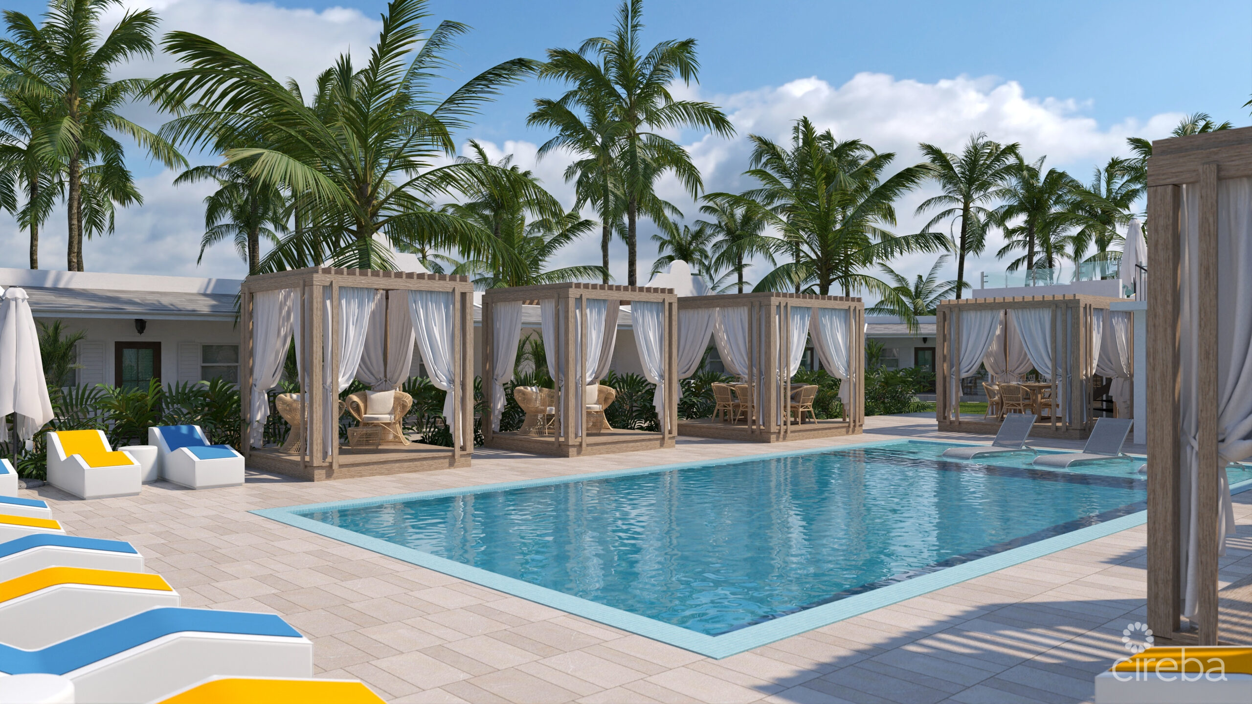 Enjoy your patio or take a few steps to the pool for a dip, relax on a lounger or in a cabana with some friends.
