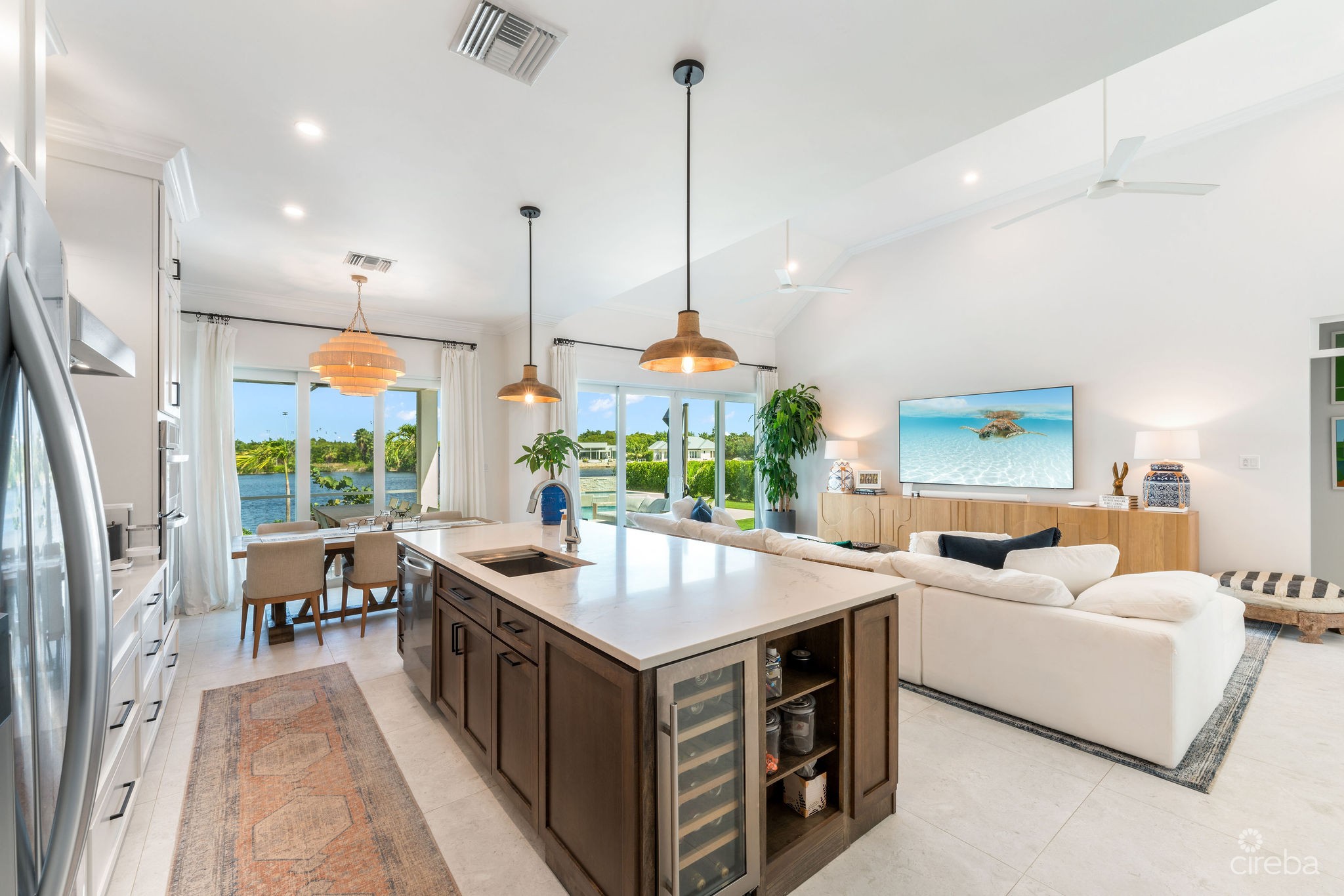 The kitchen is a chef's delight, featuring high-end appliances, granite countertops, and ample cabinet space. A spacious dining area adjacent to the kitchen provides a perfect spot for family meals with a backdrop of water views.