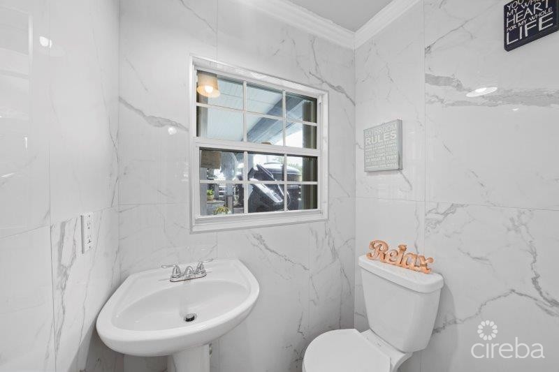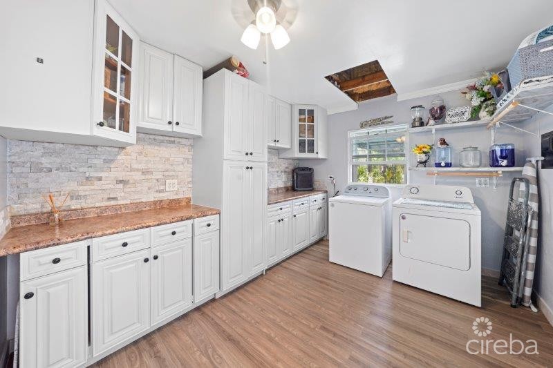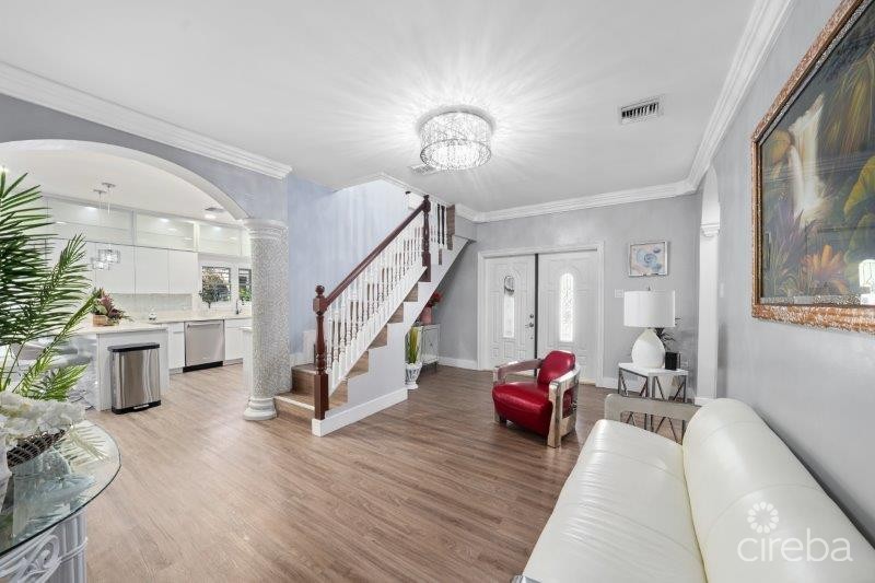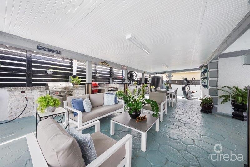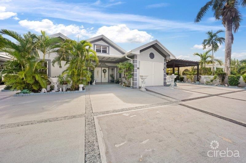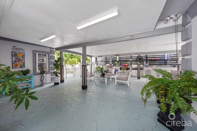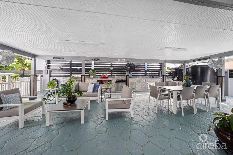 Indoor/outdoor easy living in North Sound Estates with minimum yard maintenance requirements and loads of parking! This unique 5-bedroom home will delight the family buyer who loves entertaining! You have to see this enormous covered outdoor kitchen and Lanai-style entertaining area! A 30-foot countertop is appointed with a stainless steel 4 plate BBQ grill, large griddle, Kamada Joe 'Egg-shaped' smoker, 2-burner grill, multiple propane tank storage cupboards, and stainless steel cupboards and drawers for enjoying large informal gatherings.