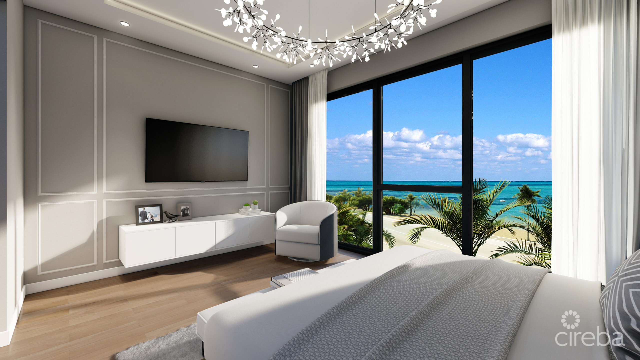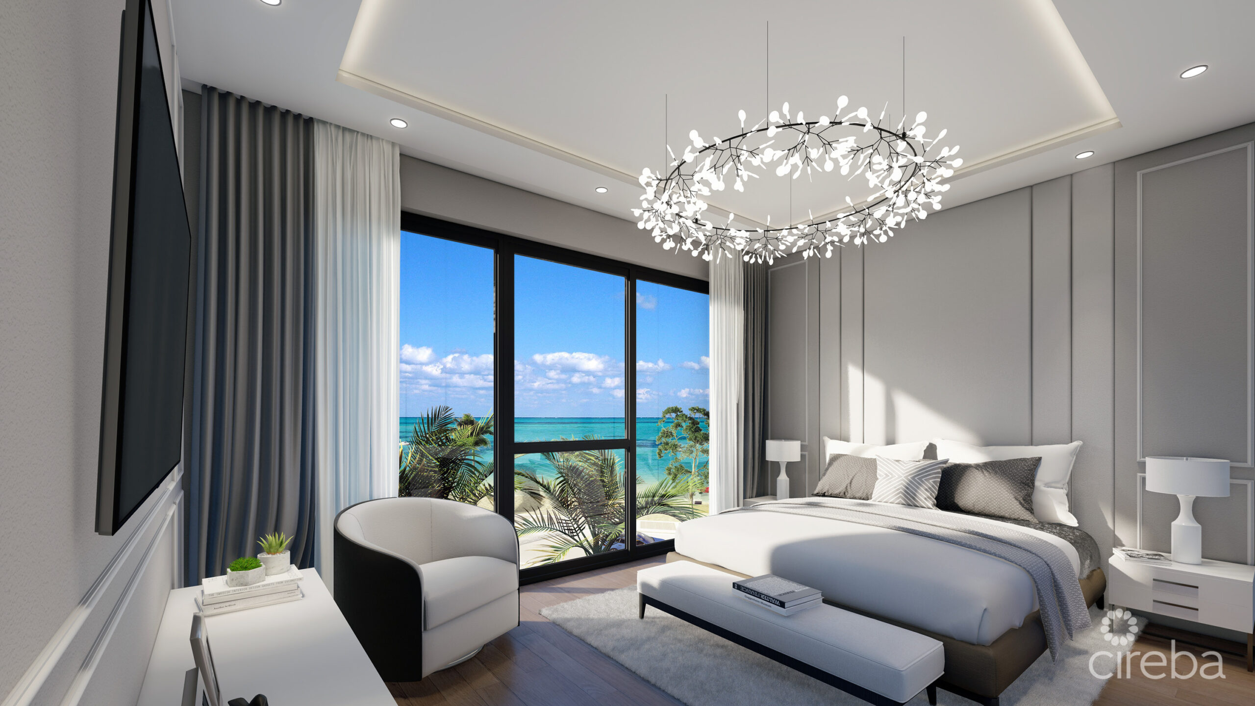 Upon entering the front door, a sleek set of stairs leads up to the first floor and into a large living room with covered terrace, dining room and powder room. The living areas enjoy views of the sea and beyond. Located on the other end of the unit, overlooking the beautiful gardens and amenities, is an expansive kitchen fitted with an oversized, eat-in centre island and high end appliances, including a wine cooler.