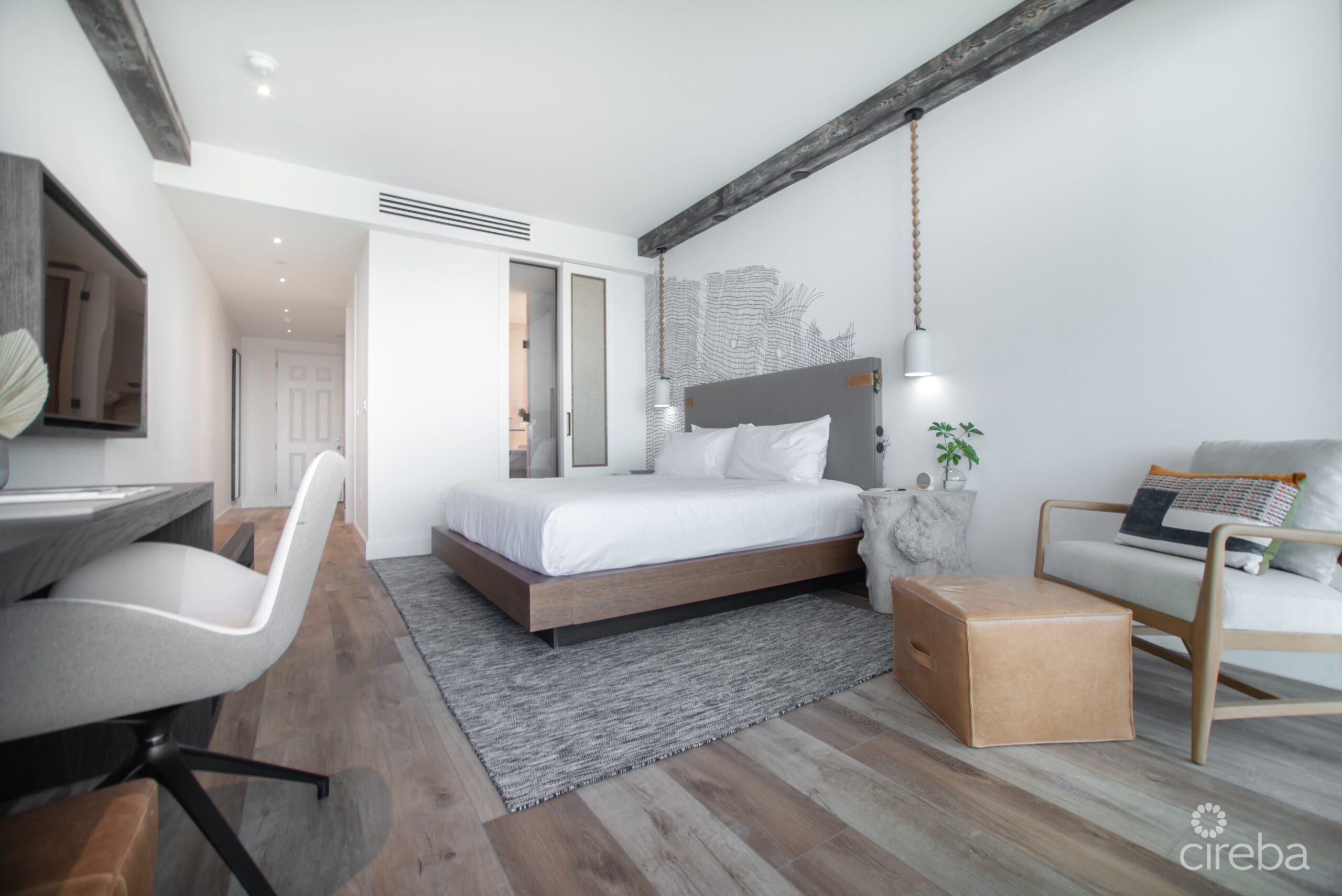 405, known as a "Sea Grape" unit, is a suite designed to optimize interior space usage. With emphasis on functionality and versatility, this room is equally delightful during the day or night. Enjoy an early morning coffee or sundowner on the private balcony, whilst soaking in the mesmerizing ocean views. Each Sea Grape unit features its own en-suite bathroom, desk, and foyer, maximizing its multifunctional potential.