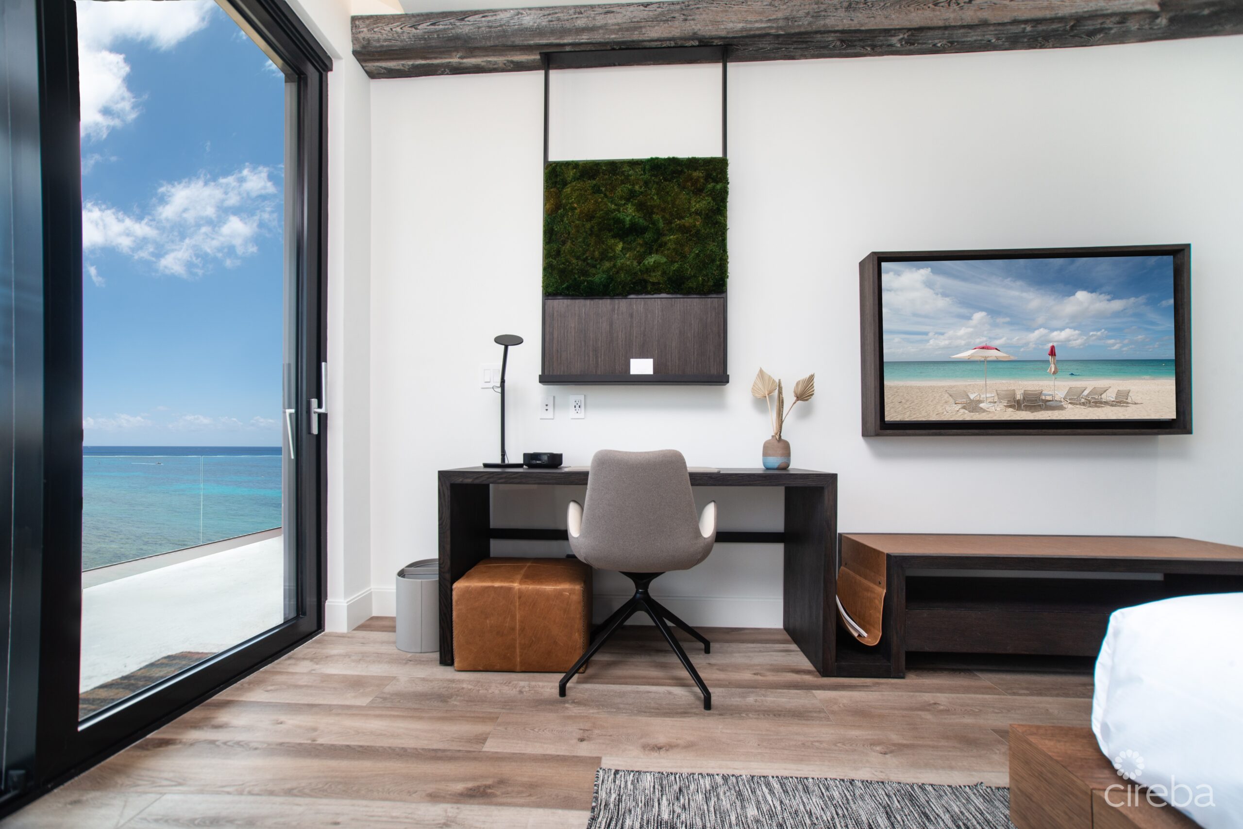 206, known as a "Sea Grape" unit, is a suite designed to optimize interior space usage. With emphasis on functionality and versatility, this room is equally delightful during the day or night. Enjoy an early morning coffee or sundowner on the private balcony, whilst soaking in the mesmerizing ocean views. Each Sea Grape unit features its own en-suite bathroom, desk, and foyer, maximizing its multifunctional potential.