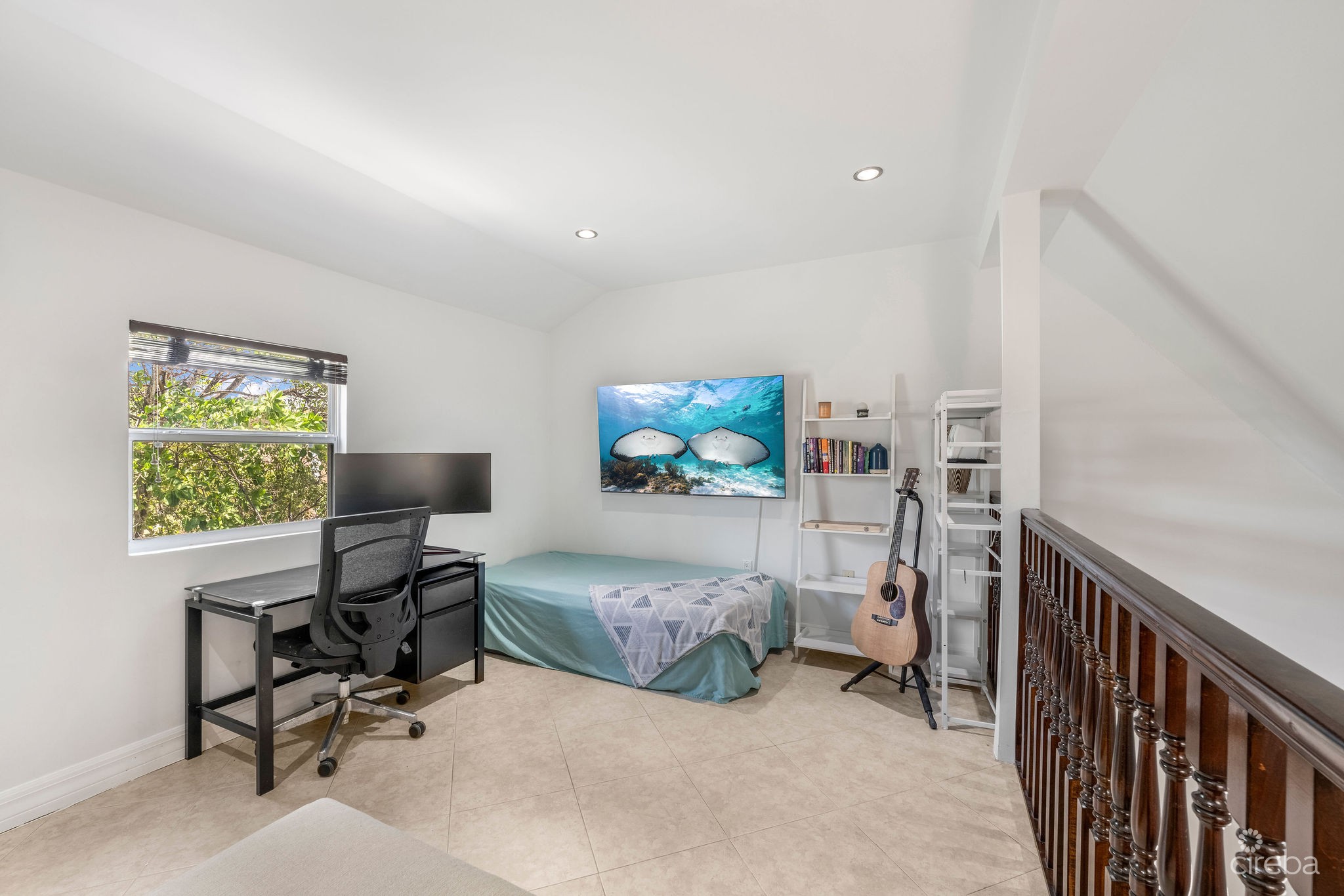 The upstairs office provides a flexible space for a home office, guest room, or additional relaxation area.