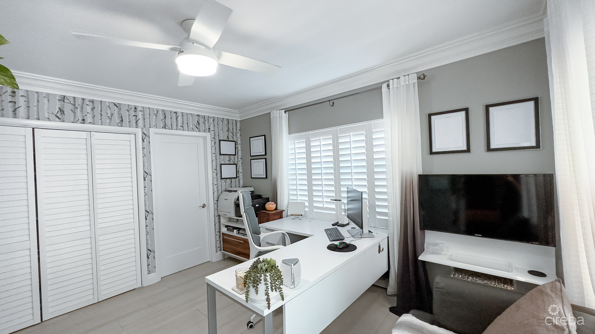 This townhouse offers the unique advantage of a dedicated home office setup. One of the bedrooms on the ground floor is designed as an office space, complete with its private patio, making it an ideal retreat for working from home.